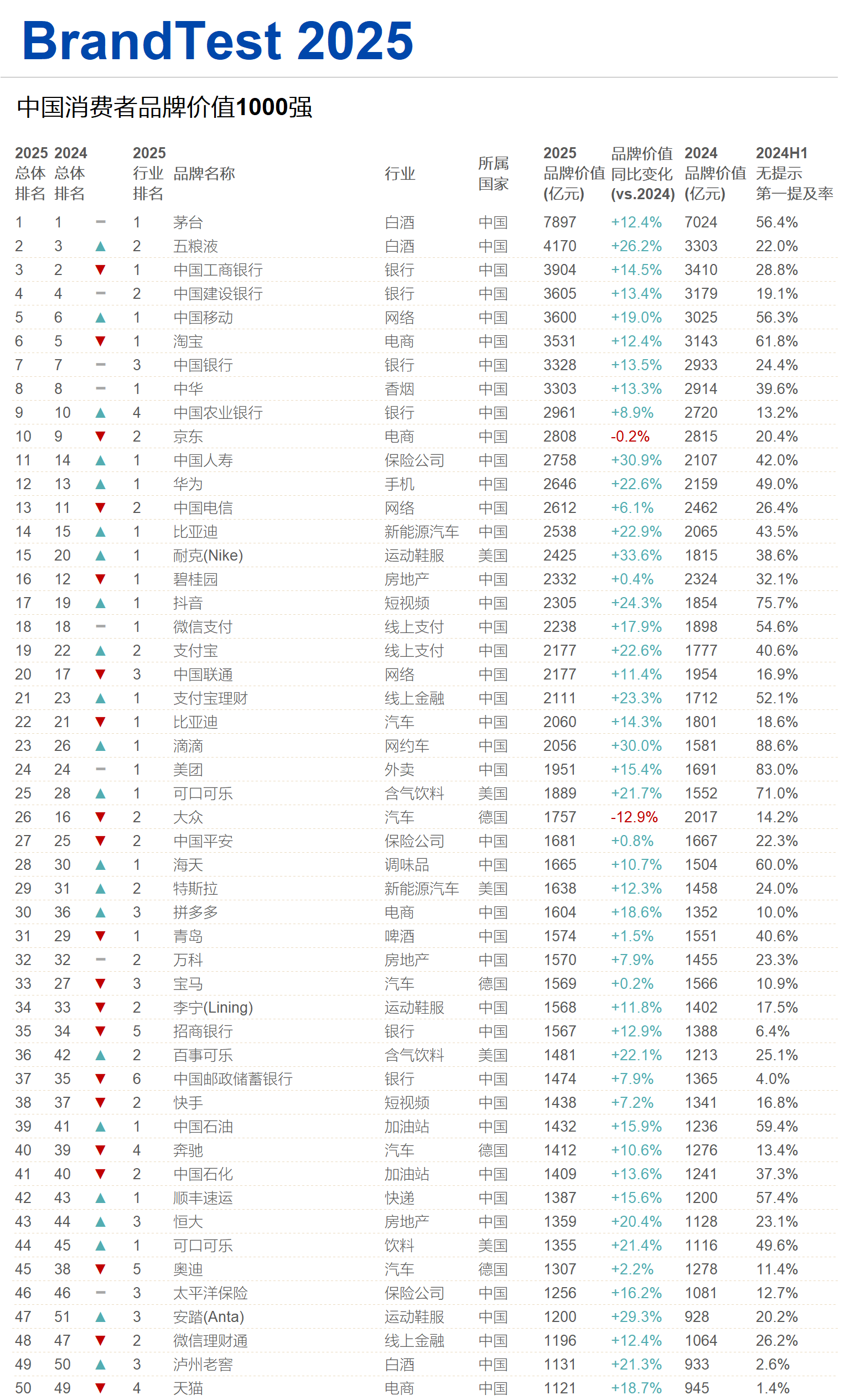 再来看看“BrandTest 2025中国消费者品牌价值”1000强榜单。